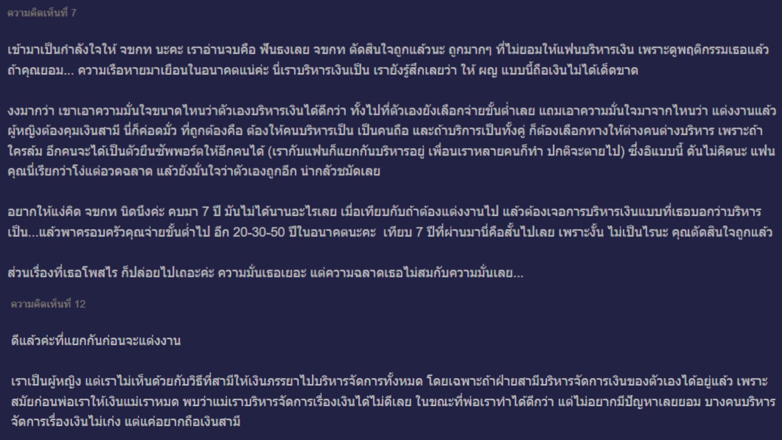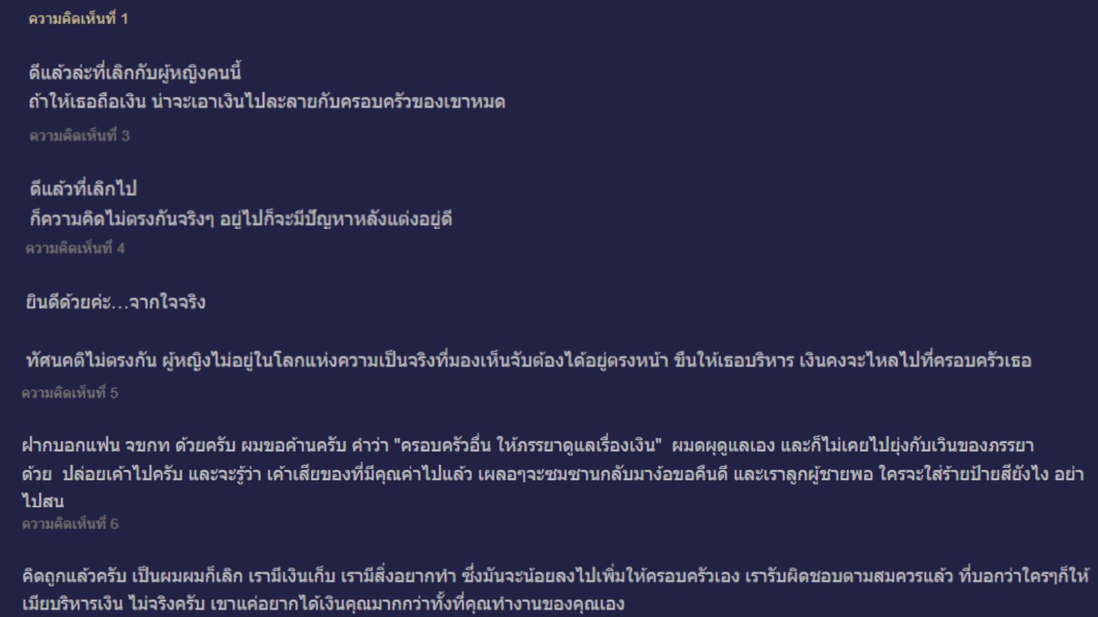 ทั้ง พอใกล้จะถึงวันแต่งงาน แฟนได้มาบอกว่า อยากให้นำเงินมาเก็บไว้ที่เธอ แล้วเธอจะบริหารจัดการเอง หากเขาอยากได้อะไรให้มาบอก แต่เขา "ไม่เห็นด้วย" เพราะก่อนหน้าที่จะมาคบกับเธอ เขาก็บริหารเงินเองมาตลอด มีเงินเก็บทุกเดือน มีการทำรายรับรายจ่าย แตกต่างจากแฟน