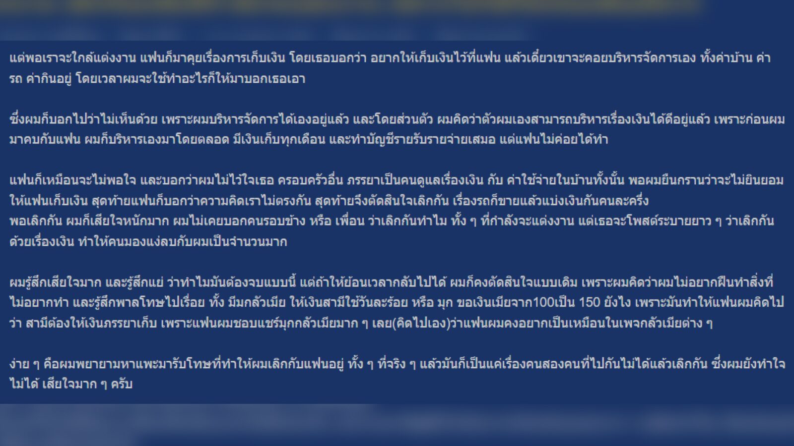 หนุ่มสุดกลั้น คบแฟนมา 7 ปี กำลังจะแต่งงาน ดันมีเหตุให้เลิก เธอไม่พอใจที่ไม่ให้บริหารเงิน อ้างครอบครัวอื่นก็ทำกัน ทำไมเธอถึงทำไม่ได้