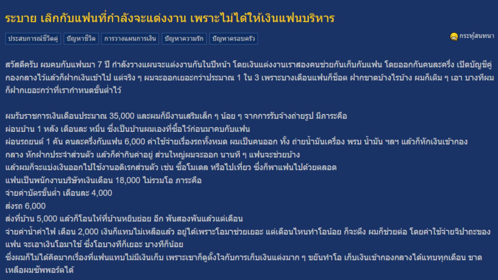 กำลังเป็นกระทู้มาแรง เมื่อสมาชิกหมายเลข 7548260 ได้โพสต์ระบายเรื่องความรัก แฟนที่คบหากันมา 7 ปี วางแผนจะแต่งงานในปีหน้า แต่ต้องมาเลิกรากันเพราะเรื่องเงินเป็นเหตุ