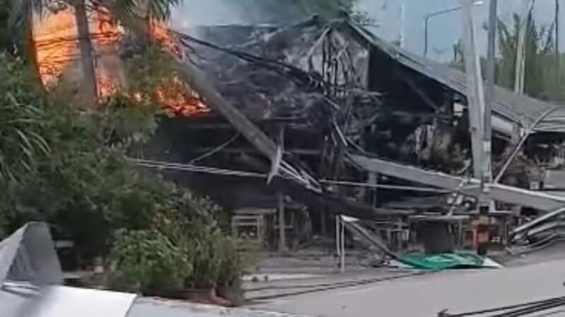 ชาวบ้านเล่านาที รถกระบะบรรทุกน้ำซิ่งหลุดโค้งชนเสาไฟฟ้าล้ม 24 ต้น ทับร้านค้าไฟไหม้เสียหาย รถจยย.พังอีก 20 คัน เจ็บ 2 ราย คาดค่าเสียหายมากกว่า 10 ล้านบาท