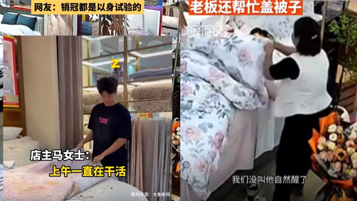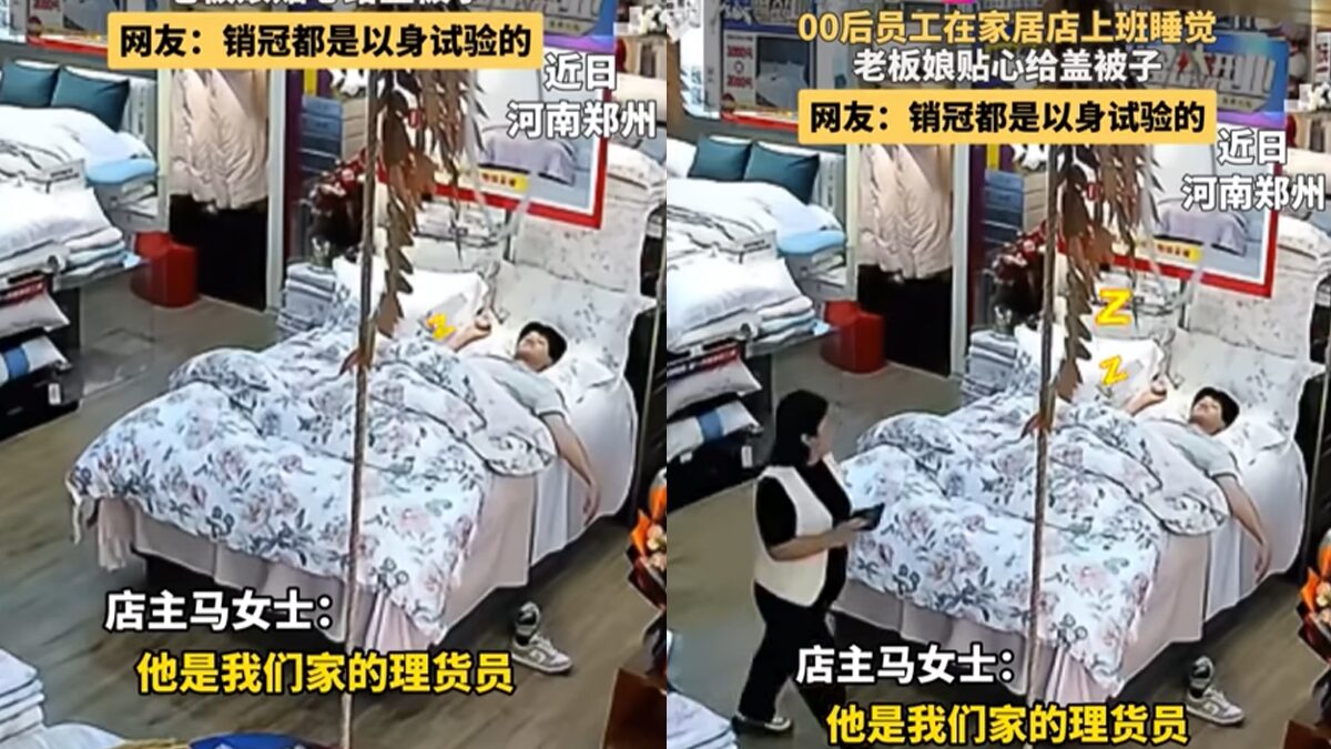พนักงานใหม่ทนง่วงไม่ไหว เผลอหลับบนเตียงโชว์ เจ้าของร้านไม่ว่า แถมห่มผ้าให้อย่างดี ชาวเน็ตแซวยับของเขาดีจริง!