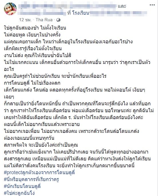 ด้านแม่เด็กในนำข้อความดังกล่าวมาโพสต์ พร้อมกับแสดงความเห็นว่า ใช่ลูกฉันสมองช้า ไม่ตั้งใจเรียน ไม่ค่อยพูด เงียบๆในบ้างครั้ง แต่คุณเคยถามเด็ก ไหมว่าเด็กอยู่ในโรงเรียนต้องเจอกับอะไรบ้าง