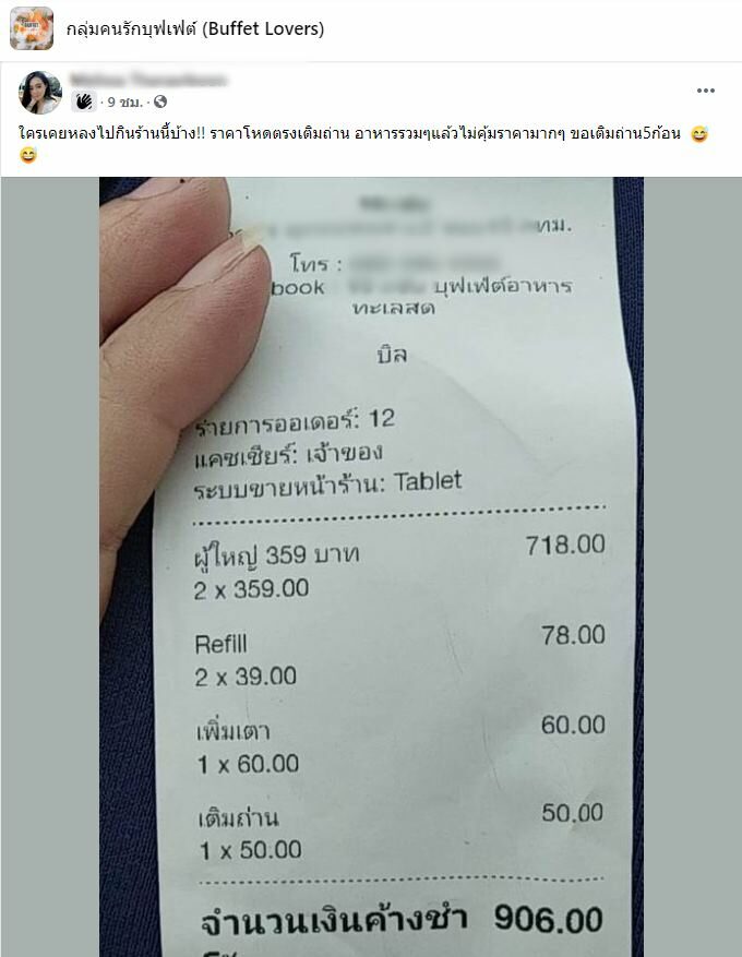 ล่าสุด สมาชิกเฟซบุ๊กรายหนึ่ง ได้โพสต์ลงในกลุ่มเฟซบุ๊กคนรักบุฟเฟต์ (Buffet Lovers)เป็นใบเสร็จจากร้านหมูกระทะ ซึ่งมีรายละเอียดของรายการคิดเงินเอาไว้เป็นราคาอาหาร การเพิ่มเตาก และ การเติมถ่าย ที่คิดราคาถ่านถึง 50 บาท โดยผู้โพสต์ระบุว่า "ใครเคยหลงไปกินร้านนี้บ้าง!! ราคาโหดตรงเติมถ่าน อาหารรวมๆ แล้วไม่คุ้มราคามากๆ ขอเติมถ่าน5ก้อน"