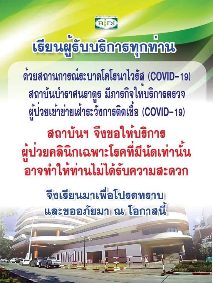 โดยระบุว่า ด้วยสถานการณ์ระบาดโรคโควิด-19 สถาบันบำราศนราดูร มีภารกิจให้บริการตรวจผู้ป่วยเข้าข่ายเฝ้าระวังการติดเชื้อ COVID-19 สถาบันฯ จึงขอให้บริการผู้ป่วยคลินิกเฉพาะโรคที่มีนัดเท่านั้น
