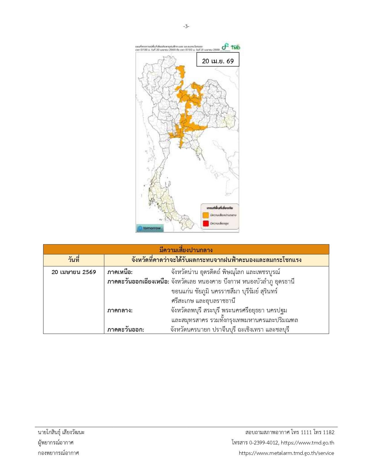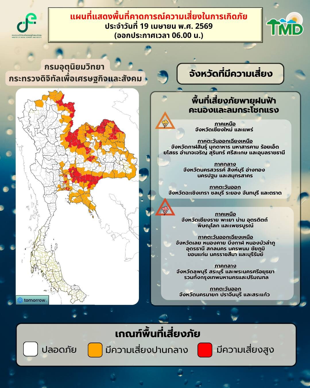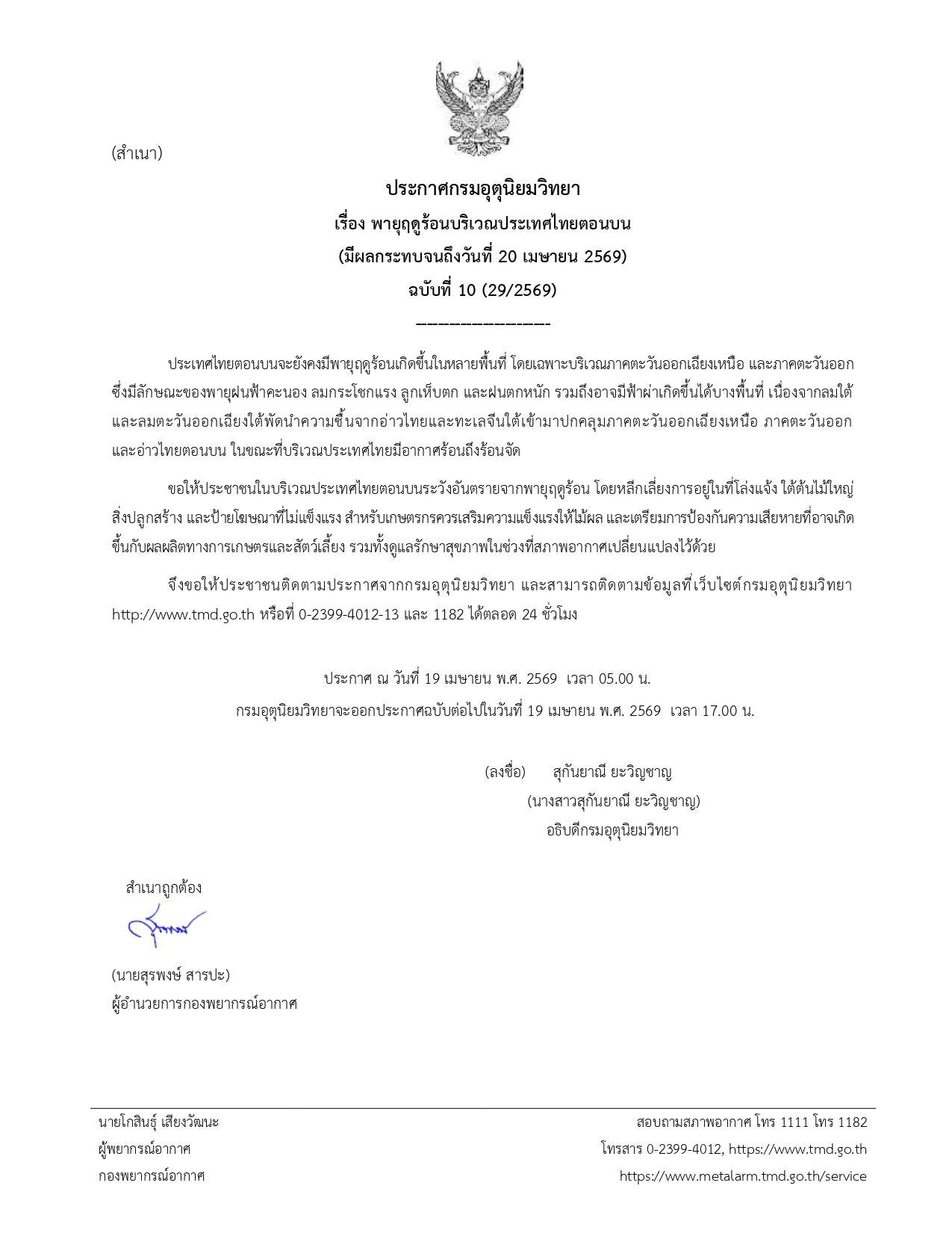วันที่ 19 เม.ย.2569กรมอุตุนิยมวิทยา ประกาศกรมอุตุนิยมวิทยา เรื่อง พายุฤดูร้อนบริเวณประเทศไทยตอนบน (มีผลกระทบจนถึงวันที่ 20 เมษายน 2569) ฉบับที่ 10 (29/2569)ความว่า ประเทศไทยตอนบนจะยังคงมีพายุฤดูร้อนเกิดขึ้นในหลายพื้นที่ โดยเฉพาะบริเวณภาคตะวันออกเฉียงเหนือ และภาคตะวันออก