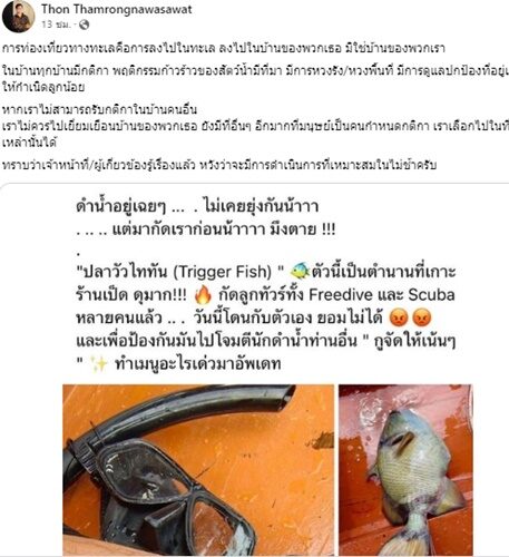 "ดำน้ำอยู่เฉยๆ ไม่เคยยุ่งกันน้าาา แต่มากัดเราก่อนน้าาาา -ึงตาย!!! "ปลาวัวไททัน (Trigger Fish) " ตัวนี้เป็นตำนานที่เกาะร้านเป็ด ดุมาก!!! กัดลูกทัวร์ทั้ง Freedive และ Scuba หลายคนแล้ว วันนี้โดนกับตัวเอง ยอมไม่ได้และเพื่อป้องกันมันไปโจมตีนักดำน้ำท่านอื่น " -ูจัดให้เน้นๆ ทำเมนูอะไรเดี๋ยวมาอัปเดต"