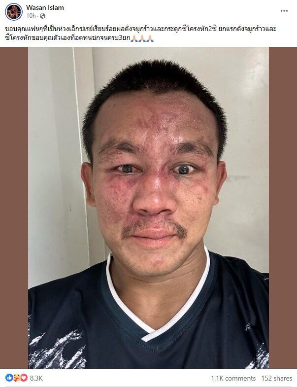 หัวใจล้วนๆ เสกสรร เปิดผลเอกซเรย์ หลังพ่ายนักชกญี่ปุ่น ดั้งจมูกร้าว-ซี่โครงหักตั้งแต่ยกแรก แต่อดทนยืนสู้จนครบ 3 ยก แฟนมวยแห่ให้กำลังใจ