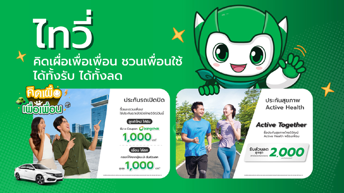 โดยมาสคอตไทวี่จะถูกนำไปใช้ในแพลตฟอร์มต่าง ๆ ของบริษัทฯ และยังมาพร้อมกับโปรโมชันพิเศษ ภายใต้คอนเซ็ปต์ “ประกันภัยที่คนใช้ และบอกต่อ” ด้วยแคมเปญ “คิดเผื่อเพื่อเพื่อน ชวนเพื่อนใช้ ได้ทั้งรับ ได้ทั้งลด” สำหรับลูกค้าใหม่ที่ซื้อ “ประกันรถเปิดปิด” ครั้งแรก รับ e-Coupon เติมน้ำมันบางจาก มูลค่า 1,000 บาท เมื่อแนะนำเพื่อนมาซื้อประกันรถเปิดปิดที่เข้าร่วมรายการ และเพื่อนยังได้รับส่วนลดสูงสุดถึง 1,000 บาท เมื่อใช้รหัสโปรโมชันที่เพื่อนแนะนำ นอกจากนี้สำหรับประกันภัยสุขภาพ Thaivivat Active Health เมื่อซื้อพร้อมเพื่อน ยังได้รับส่วนลดสูงสุดท่านละ 2,000 บาท โดยสามารถสอบถามรายละเอียดหรือติดตามข่าวสารและโปรโมชันอัปเดตของไทยวิวัฒน์ได้ที่ www.thaivivat.co.th หรือโทร.02-200-7000 ตั้งแต่วันนี้ ถึง 30 มิถุนายน 2567