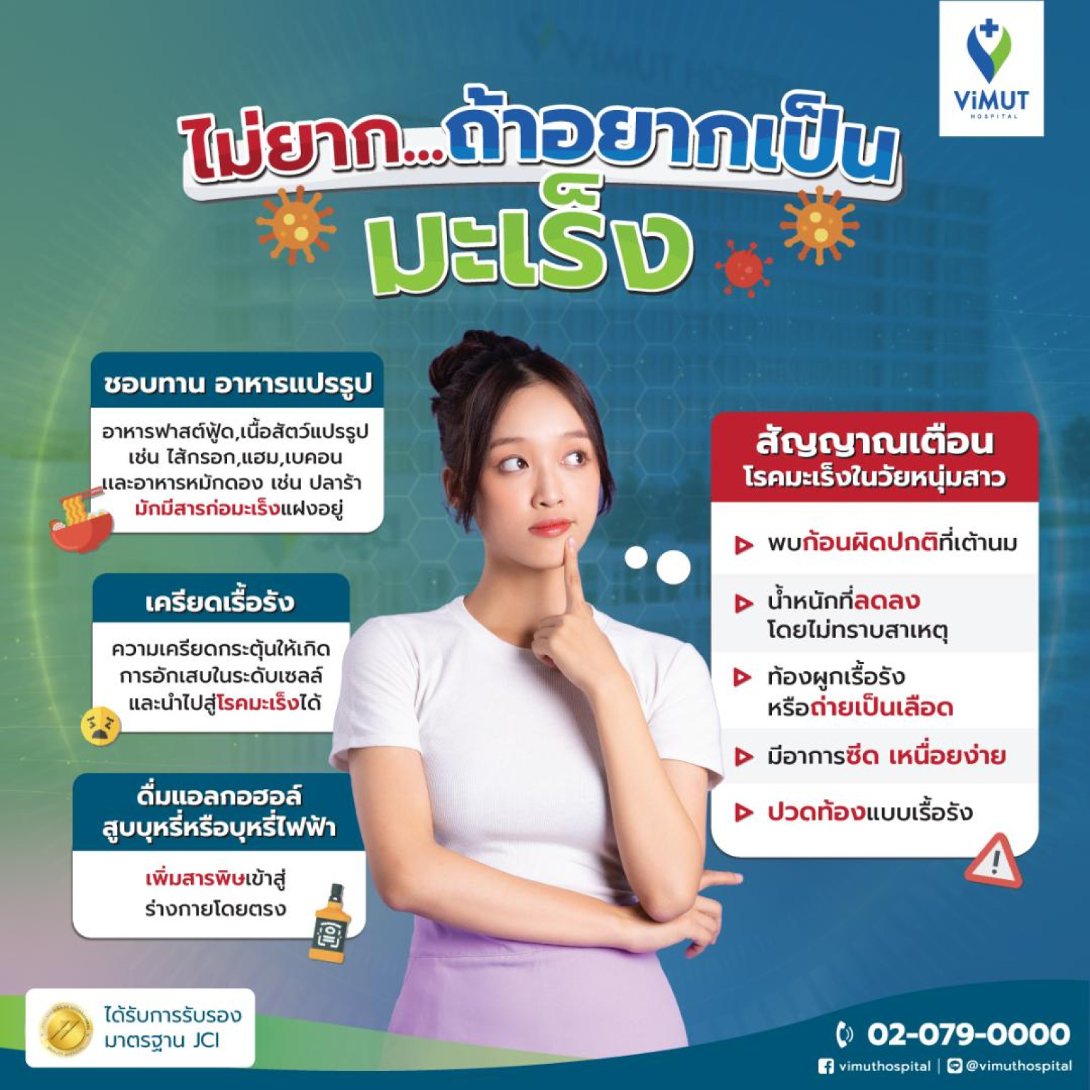 จากผลวิจัยของ BMJ Oncology ปี 2023 เผยว่ายอดผู้ป่วยมะเร็งในกลุ่มอายุต่ำกว่า 50 ปีทั่วโลกพุ่งสูงถึง 79% ในเวลาเพียง 30 ปี และคาดการณ์ว่า ภายในปี 2030 ผู้ป่วยรายใหม่ที่อายุไม่ถึง 50 ปี จะเพิ่มขึ้นอีกถึง 31% และมีผู้เสียชีวิตเพิ่มขึ้น 21% นี่ไม่ใช่แค่ตัวเลข แต่มันคือสัญญาณเตือนที่ตอกย้ำว่ามะเร็งไม่ใช่แค่โรคของผู้สูงอายุอีกต่อไป แพทย์ รพ.วิมุต ชี้ ถึงเวลาแล้วที่เราต้อง “เปลี่ยนพฤติกรรม” และ “หาเวลาตรวจสุขภาพ” ก่อนที่โรคร้ายจะแพร่กระจาย
