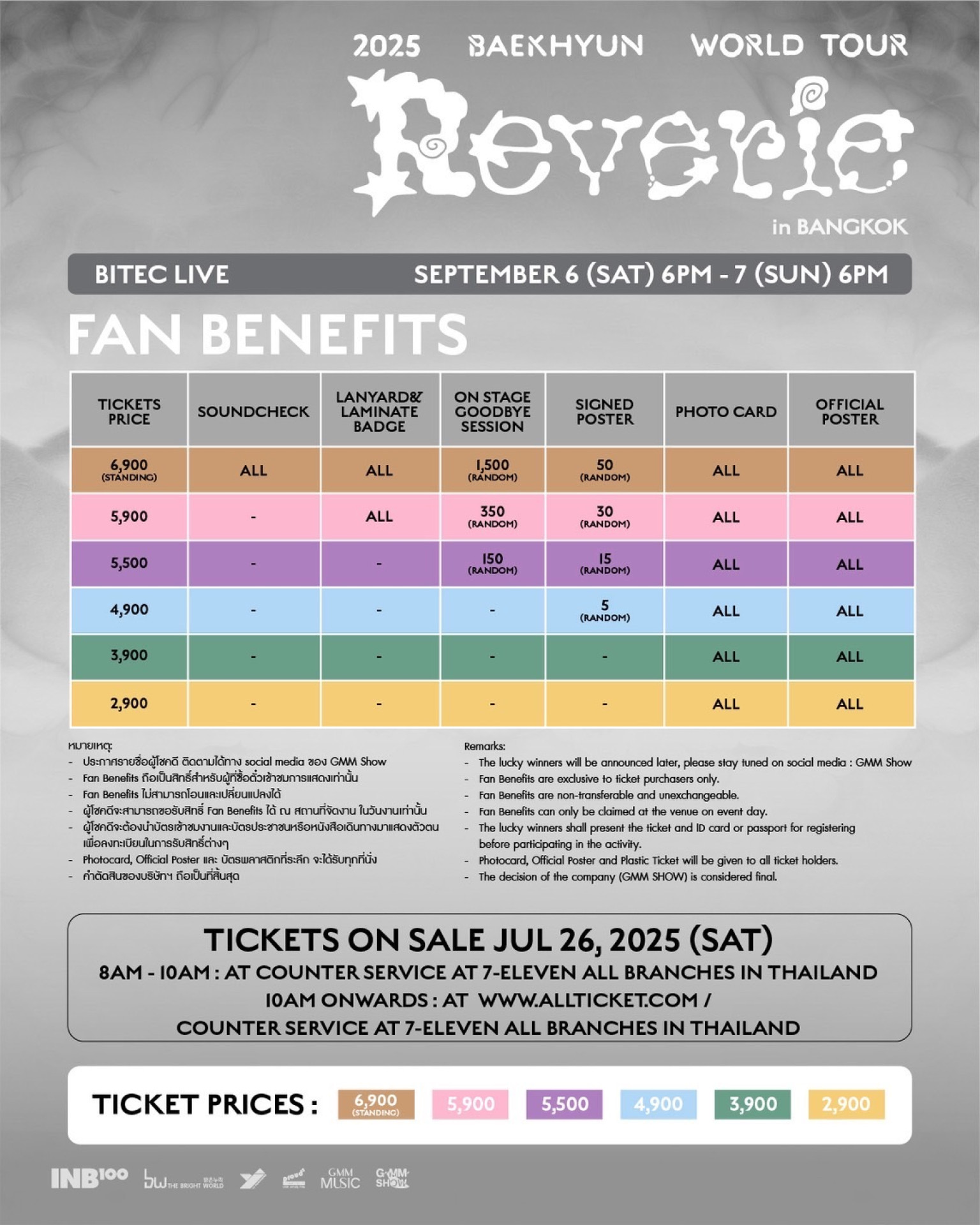 เปิดจำหน่ายบัตร วันเสาร์ที่ 26 ก.ค.68 ตั้งแต่เวลา 08:00 น. – 10:00 น. เปิดจำหน่าย เฉพาะที่เคาน์เตอร์เซอร์วิสในร้าน 7-Eleven ทุกสาขาทั่วประเทศ และ ตั้งแต่เวลา 10:00 น. เป็นต้นไป เปิดจำหน่ายทุกช่องทาง ทั้งเคาน์เตอร์เซอร์วิสในร้าน 7-Eleven ทุกสาขาทั่วประเทศ และเว็บไซต์ ALL TICKET (www.allticket.com)