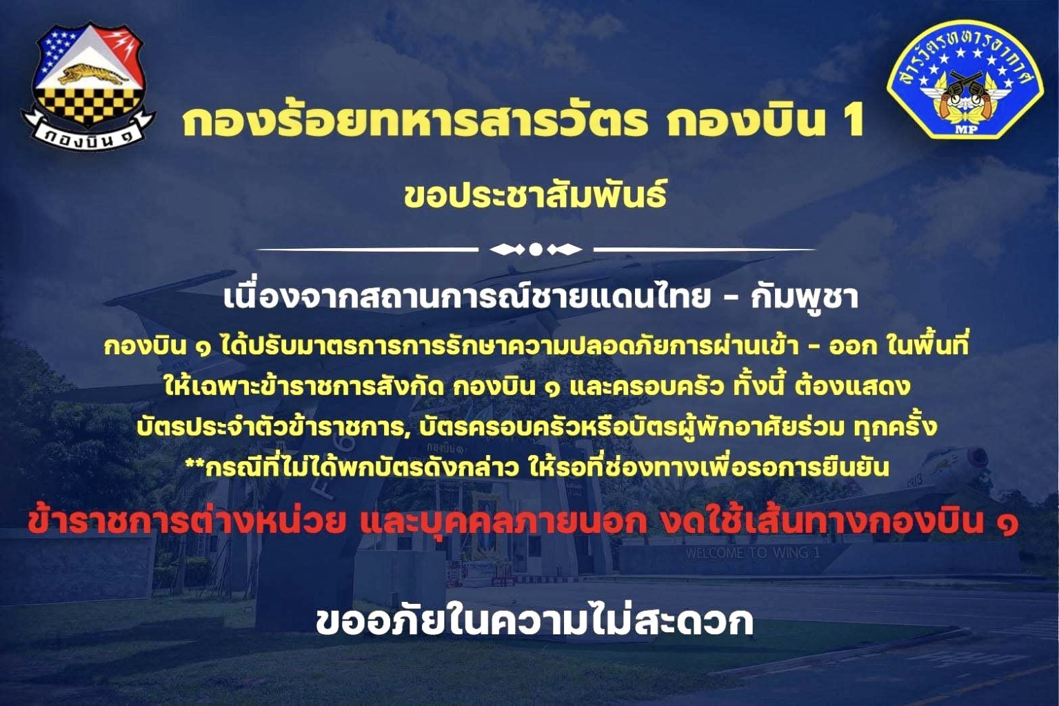 ก่อนหน้านี้ กองบิน1 จ. นครราชสีมา ได้มีข้อความแจ้งเตือนว่า เนื่องจากสถานการณ์ชายแดนไทย - กัมพูชา กองบิน 1 ได้ปรับมาตรการการรักษาความปลอดภัยการผ่านเข้า - ออก ในพื้นที่ให้เฉพาะข้าราชการสังกัด กองบิน 1 และครอบครัว ทั้งนี้ ต้องแสดง บัตรประจำตัวข้าราชการ, บัตรครอบครัวหรือบัตรผู้พักอาศัยร่วม ทุกครั้ง