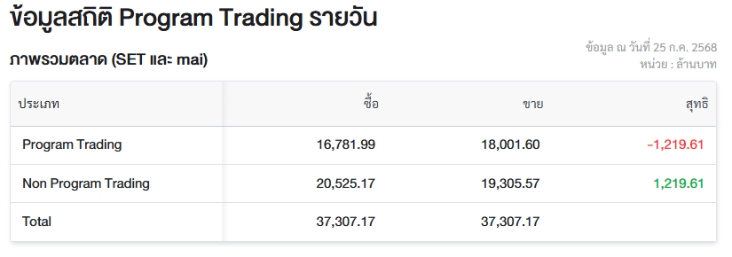 อัพเดต 25 ก.ค. 2568 เวลา 12.55 น. • เผยแพร่ 25 ก.ค. 2568 เวลา 12.55 น. • ข่าวหุ้นธุรกิจออนไลน์ผู้สื่อข่าวรายงานว่า วันนี้ (25 ก.ค.68) ตลาดหลักทรัพย์แห่งประเทศไทย (ตลท.) เปิดเผยข้อมูลซื้อขายรายวันผ่าน Program Trading หรือ “โปรแกรมโรบอทเทรดดิ้ง” มีมูลค่าซื้อจำนวน 16,781.99 ล้านบาท และมูลค่าขายจำนวน 18,001.60 ล้านบาท เท่ากับขายสุทธิ 1,219.61 ล้านบาท