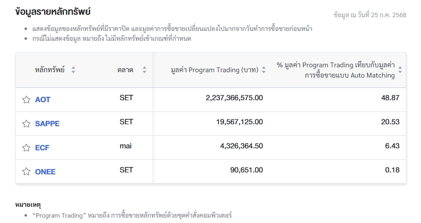 นอกจากนี้ ตลท.ยังรายงานข้อมูลหลักทรัพย์ที่ใช้ Program Trading ซื้อขายสูงสุด 4 อันดับ โดยเรียงจากเปอร์เซ็นต์ (%) มูลค่า Program Trading เทียบกับมูลค่าการซื้อขายแบบ Auto Matching ดังนี้