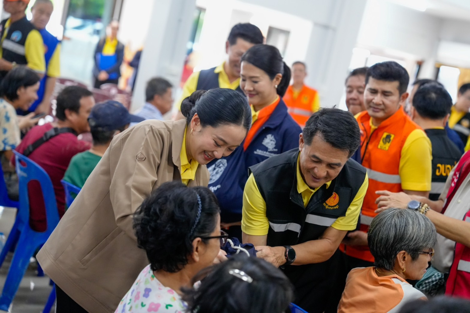 จากนั้น น.ส.แพทองธาร พบปะให้กำลังใจและมอบถุงยังชีพให้กับประชาชนที่ประสบภัยน้ำท่วม พร้อมกล่าวว่า เรื่องของสถานที่ต่างๆ ทั้งวัด โบราณสถานที่ได้รับความเสียหาย กระทรวงวัฒนธรรมก็มาด้วยกันเพื่อมาดูแล และตนลงพื้นที่ในฐานะเป็นตัวแทนของคณะรัฐมนตรี (ครม.) มาให้กำลังใจพี่น้องประชาชนทุกท่าน ก่อนหน้านี้ รัฐมนตรีหลายท่านก็ลงมาแล้ว วันนี้ยินดีอย่างยิ่งที่ได้มาลงพื้นที่