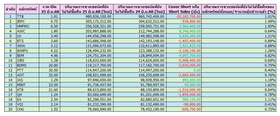 เปิด 20 อันดับหุ้นถูก “Cover-Short” สูงสุด ณ 25 มิ.ย.68