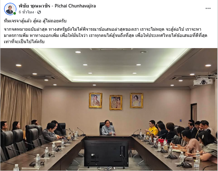 ล่าสุด นายพิชัย ชุณหวชิร รองนายกรัฐมนตรีและรัฐมนตรีว่าการกระทรวงการคลัง ในฐานะหัวหน้าคณะเจรจาฝ่ายไทย โพสต์ผ่านเฟซบุ๊กระบุว่า “ทีมเจรจาสู้แล้ว สู้ต่อ สู้ไม่ถอยครับ จากจดหมายฉบับล่าสุด ทางสหรัฐยังไม่ได้พิจารณาข้อเสนอล่าสุดของเรา เราจะไม่หยุด จะสู้ต่อไป เราจะหามาตรการเพิ่ม หาทางออกเพิ่ม เพื่อให้มั่นใจว่าเราทุกคนได้สู้จนถึงที่สุด เพื่อให้ประเทศไทยได้ข้อเสนอที่ดีที่สุดเท่าที่จะเป็นไปได้ครับ”