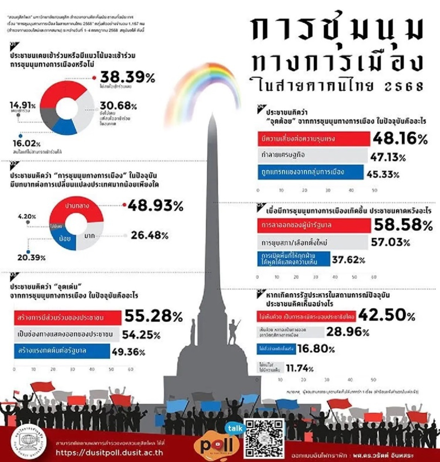 วันที่ 6 ก.ค.68 สวนดุสิตโพล จากมหาวิทยาลัยสวนดุสิต ได้ทำการสำรวจความคิดเห็นของประชาชนทั่วประเทศเกี่ยวกับ “การชุมนุมทางการเมืองในสายตาคนไทย 2568” ซึ่งมีผู้ตอบแบบสำรวจจำนวน 1,167 คน (สำรวจทางออนไลน์และภาคสนาม) ระหว่างวันที่ 1-4 กรกฎาคม 2568 โดยผลสำรวจพบข้อมูลที่น่าสนใจดังนี้: