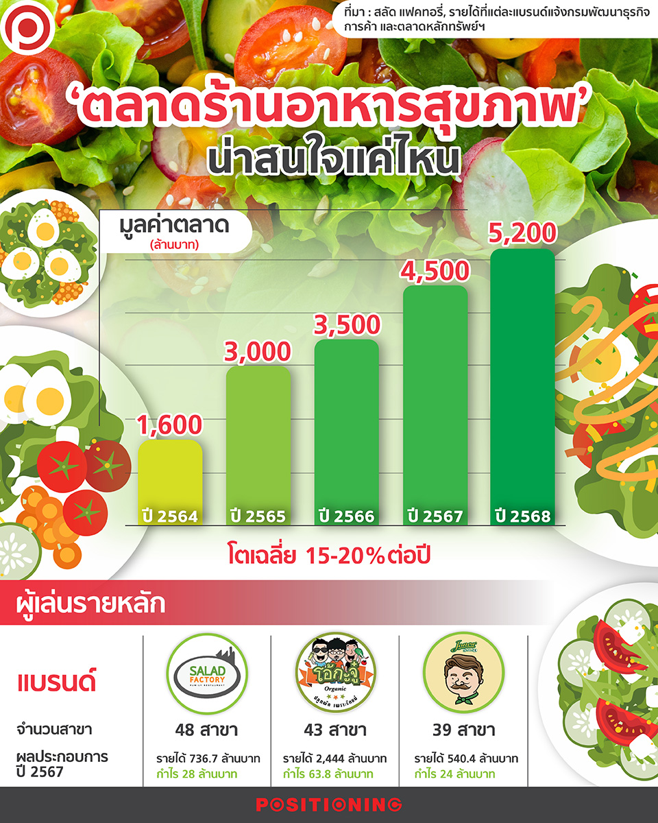 โดยปี 2564 ตลาดร้านอาหารเพื่อสุขภาพมีมูลค่าอยู่ที่ 1,600 ล้านบาท, ปี 2565 มีมูลค่า 3,000 ล้านบาท, ปี 2566 มีมูลค่า 3,500 ล้านบาท, ปี 2567 มูลค่า 4,500 ล้านบาท และปี 2568 คาดการณ์มีมูลค่าอยู่ที่ 5,200 ล้านบาท