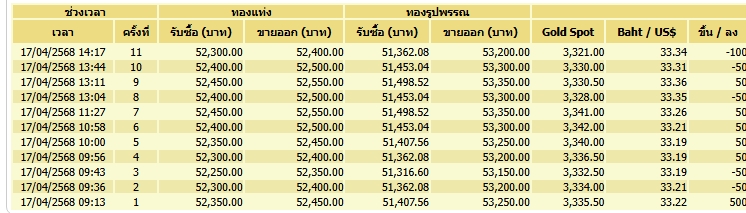 อ่านข่าวต้นฉบับได้ที่ : ราคาทองวันนี้ (17 เม.ย. 68) ปรับ 12 ครั้ง ขึ้น 400 บาท ทองรูปพรรณ 53,150 บาท