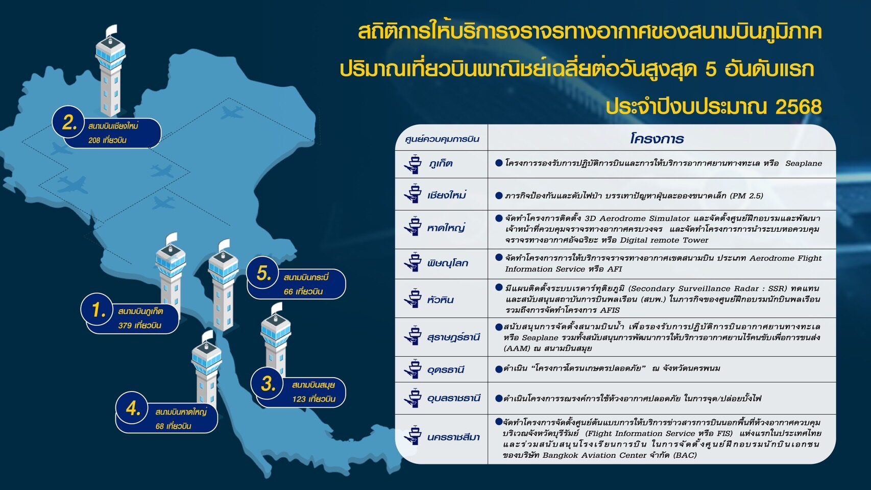 วันที่ 28 ก.พ. 2568 นางมนพร เจริญศรี รัฐมนตรีช่วยว่าการกระทรวงคมนาคม เปิดเผยว่า บริษัท วิทยุการบินแห่งประเทศไทย จำกัด (บวท.) ได้รายงานสถิติการให้บริการจราจรทางอากาศของสนามบินภูมิภาคที่มีปริมาณเที่ยวบินพาณิชย์เฉลี่ยต่อวันสูงสุด 5 อันดับแรก ประจำปีงบประมาณ 2568 ได้แก่ สนามบินภูเก็ต ที่มีปริมาณเที่ยวบินสูงสุด 379 เที่ยวบิน รองลงมาเป็น สนามบินเชียงใหม่ 208 เที่ยวบิน สนามบินสมุย 123 เที่ยวบิน สนามบินหาดใหญ่ 68 เที่ยวบิน และสนามบินกระบี่ 66 เที่ยวบิน ตามลำดับ