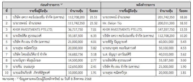 ทั้งนี้บริษัทฯขอแจ้งให้ทราบว่า บริษัทฯได้ดำเนินการเสนอขายหุ้นสามัญเพิ่มทุนให้แก่ผู้ถือหุ้นเดิมตามสัดส่วนการถือหุ้น (Rights Offering) เสร็จสิ้นเป็นที่เรียบร้อยแล้ว และบริษัทฯได้ดำเนินการจดทะเบียนเปลี่ยนแปลงทุนชำระแล้วของบริษัทฯ ต่อกรมพัฒนาธุรกิจการค้า กระทรวงพาณิชย์เรียบร้อยแล้วเมื่อวันที่ 22 กันยายน 2568 ส่งผลให้โครงสร้างการถือหุ้นและผู้ถือหุ้นราย ใหญ่ของบริษัทฯ มีการเปลี่ยนแปลงโดยมีรายละเอียด ดังต่อไปนี้