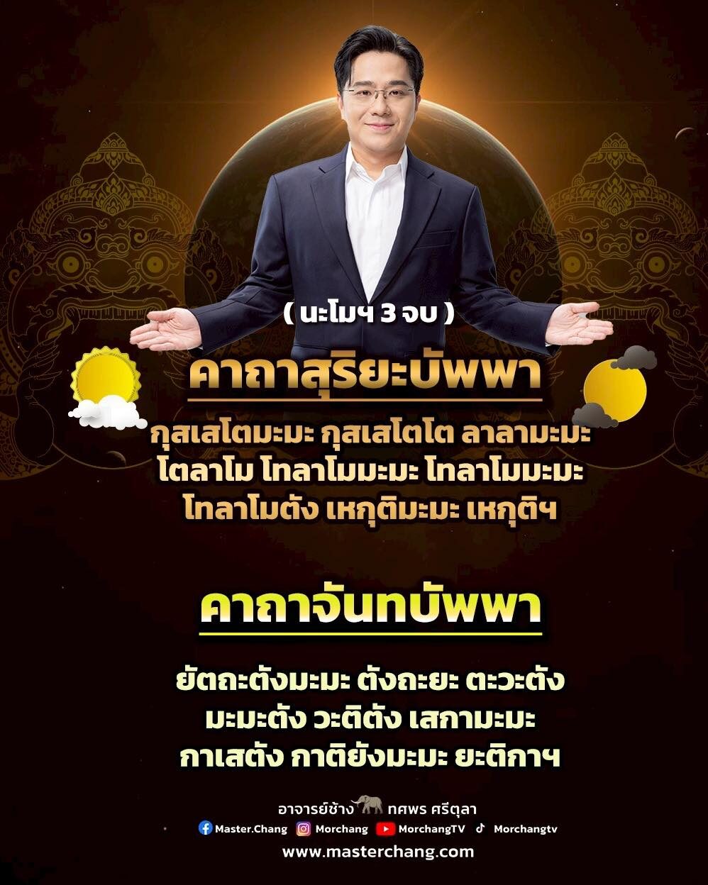 คาถาสุริยะบัพพา : กุสเสโตมะมะ กุสเสโตโต ลาลามะมะ โตลาโม โทลาโมมะมะ โทลาโมมะมะ โทลาโมตัง เหกุติมะมะ เหกุติฯ