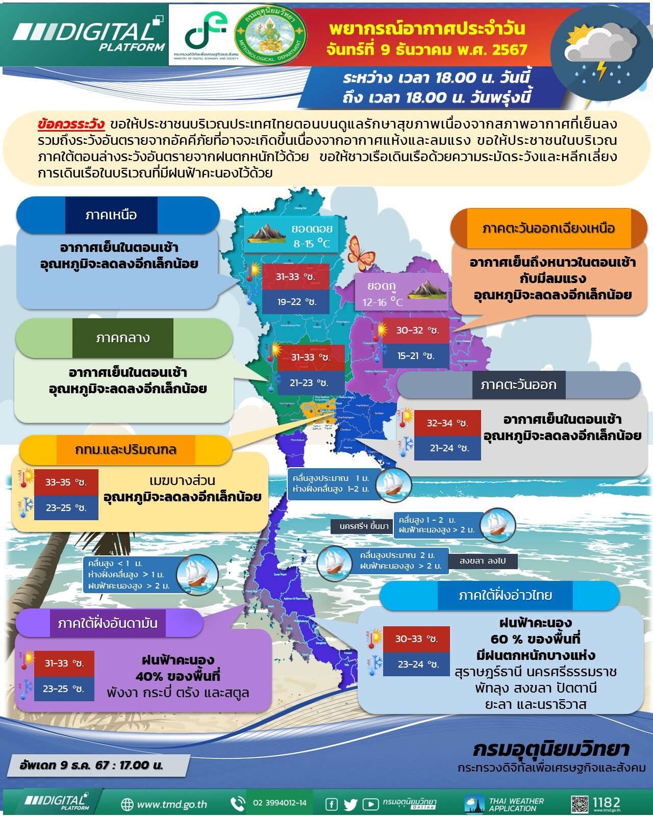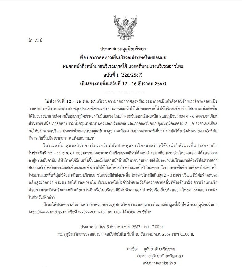 วันที่ 9 ธ.ค.2567 กรมอุตุนิยมวิทยา ประกาศกรมอุตุนิยมวิทยา เรื่อง อากาศหนาวเย็นบริเวณประเทศไทยตอนบน ฝนตกหนักถึงหนักมากบริเวณภาคใต้ และคลื่นลมแรงบริเวณอ่าวไทย ฉบับที่ 1(328/2567) (มีผลกระทบตั้งแต่วันที่ 12 - 16 ธันวาคม 2567)