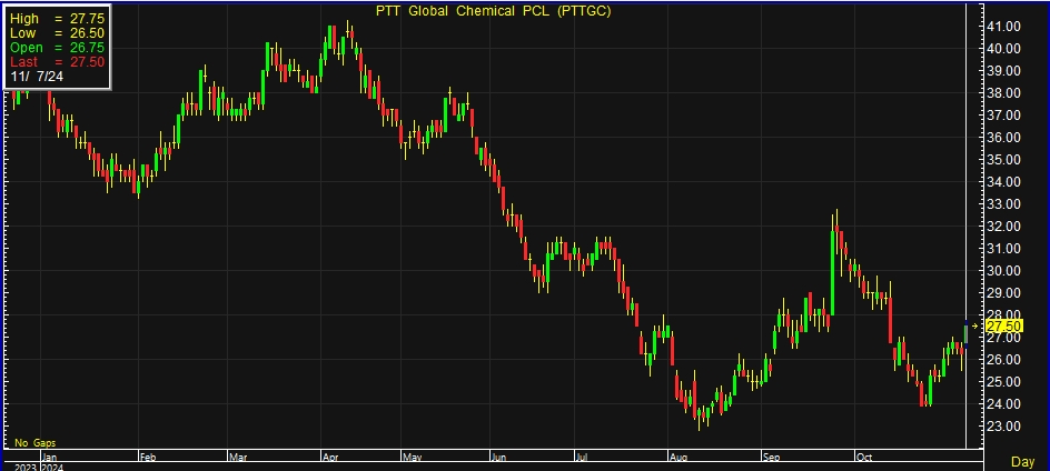 โดยราคาหุ้น PTTGC ปรับตัวขึ้นแรงวันนี้ คาดการณ์ว่านักลงทุนเข้าซื้อหลังรายงานผลประกอบการงวดไตรมาส 3/67 ออกมาตามคาดการณ์ โดยบริษัทรับรู้รายการที่ไม่ได้เกิดขึ้นจากการดำเนินงานปกติ/ควบคุมไม่ได้ ได้แก่ ขาดทุนจากสต๊อกน้ำมัน และรายการการปรับมูลค่าสินค้าคงเหลือให้เท่ากับมูลค่าสุทธิที่จะได้รับ (Stock Loss Net NRV) รวม 3,912 ล้านบาท
