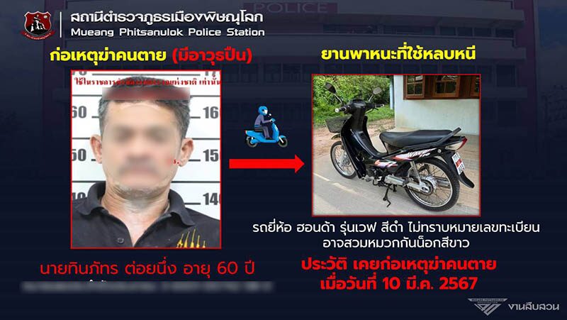 วันที่ 31 ธ.ค. 2567 ผู้สื่อข่าวรายงานความคืบหน้า คดีนายทินภัทร ต่อยนึ่ง อายุ 60 ปี ชาว จ.พิษณุโลก ผู้ก่อเหตุยิงนายนกเล็ก นิลทอง อายุ 66 ปี กระสุนปืนเข้าใบหน้าและแผ่นหลัง ส่วนนางแสงเดือน นิลทอง อายุ 61 ปี ภรรยา ถูกกระสุนปืนยิงเข้าหน้าอก เสียชีวิตทั้ง 2 ราย เหตุเกิดบริเวณริมถนนสายบายพาสเส้นเลี่ยงเมืองสี่แยกดงประโดกมุ่งหน้าสี่แยกไทยแอร์โรว์ หมู่ 4 บ้านตาลสุวรรณ ต.ดอนทอง อ.เมือง จ.พิษณุโลก