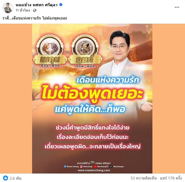 เตือนไว้ราศีไหนบ้างไม่ต้องพูดเยอะ หมอช้าง ทศพร โพสต์เตือนช่วงเดือนแห่งความรัก 14 กุมภาพันธ์ วันวาเลนไทน์ 2 ราศี มีเรื่องต้องระวังว่า