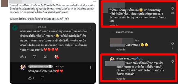 ด้านนัท นิสามณี ก็ได้เข้ามาตอบไว้ว่า"ขอบคุณที่น่ารักกับนัทมาก ๆ นะงับ แต่นัทลบเพราะ อะไรก้ตามที่เป็นคอมเม้นเชิง ลบ หรือ เกิดการทำให้ใครไม่สบายใจต้องขอลบนะค้า"