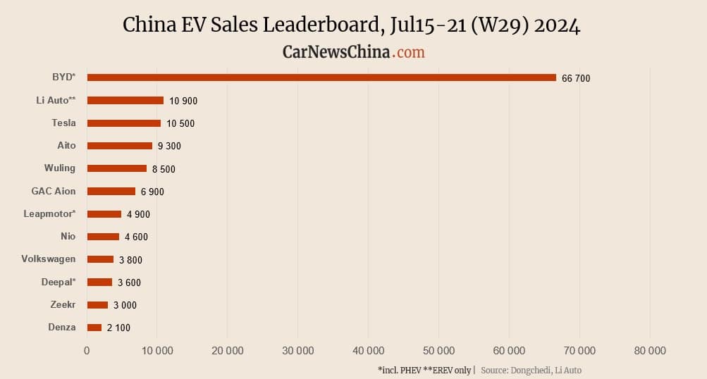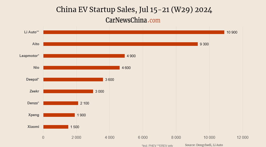 2. Li Auto มียอดจดทะเบียน EV 10,900 คัน ลดลง 54% จาก 11,300 คันในสัปดาห์ก่อน และเพิ่มขึ้น 39.74% จาก 7,800 คันในสัปดาห์เดียวกันของปีก่อน ในช่วงสามสัปดาห์แรกของเดือนกรกฎาคม Li Auto มียอดจดทะเบียนรถยนต์ไฟฟ้า 30,200 คันในประเทศจีน