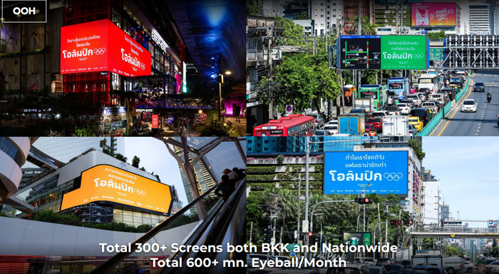 OOH หรือสื่อโฆษณานอกบ้านจะเป็นพื้นที่เริ่มต้น Kick-off ความยิ่งใหญ่ของโอลิมปิกและพาราลิมปิกเกมส์ ภาพความยิ่งใหญ่ของคอนเซปต์การแข่งขัน สนามแข่งขันที่มีพื้นหลังเป็นเมืองปารีส รวมถึงภาพของทีมนักกีฬาไทยจะเปิดตัวพร้อมกันบนจอทั่วประเทศเพื่อเข้าถึงคนดูผ่านสื่อนอกบ้านในครั้งนี้ โดยนำเสนอคอนเทนต์หลายหลายรูปแบบ ได้แก่