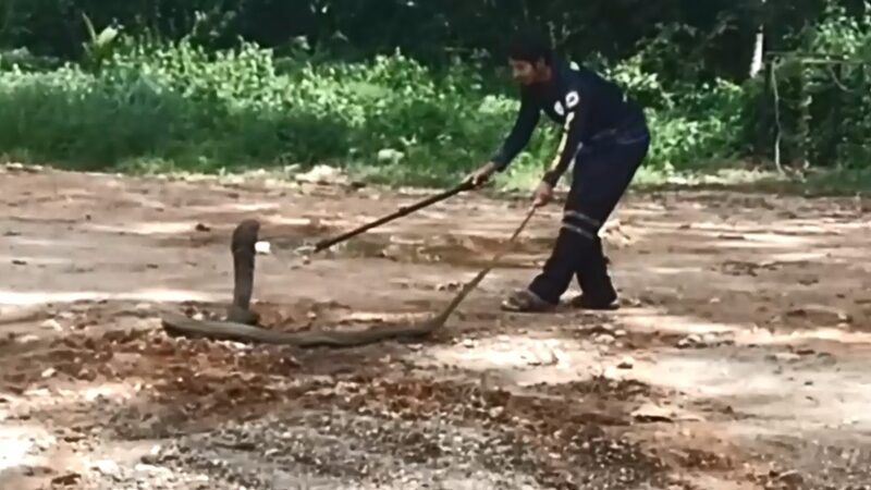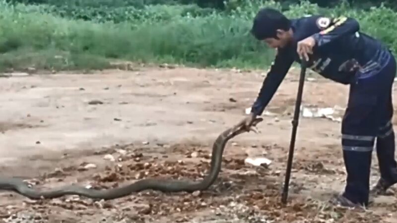 ซึ่งต่อมาเจ้าหน้าที่สามารถจับหางงูจงอางยักษ์ไว้ได้ รีบลากออกมาที่โล่ง ก่อนใช้มือเปล่าจับหัวงูจงอางยักษ์ไว้ได้ นำมาวัดได้ยาว 4.03 เมตร จึงรีบนำใส่กระสอบ เตรียมนำไปปล่อยคืนสู่ป่าธรรมชาติต่อไป