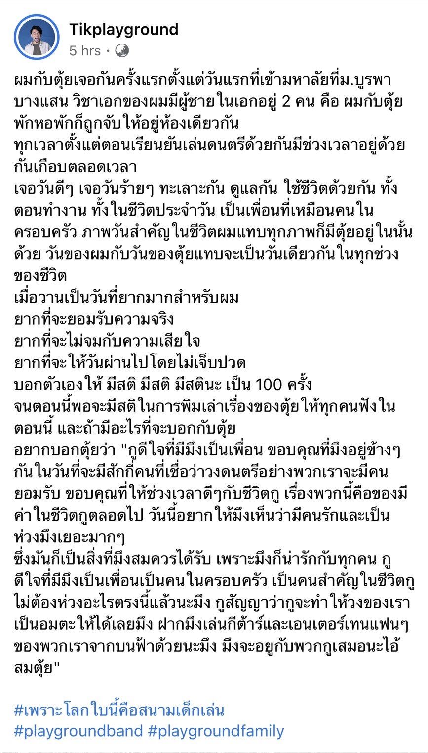 “กูสัญญาว่ากูจะทำให้วงของเราเป็นอมตะให้ได้เลยมึง ฝากมึงเล่นกีต้าร์และเอนเตอร์เทนแฟนๆ ของพวกเราจากบนฟ้าด้วยนะมึง มึงจะอยูกับพวกกูเสมอนะไอ้สมตุ้ย #เพราะโลกใบนี้คือสนามเด็กเล่น #playgroundband #playgroundfamily”