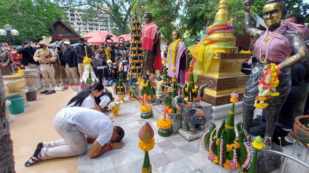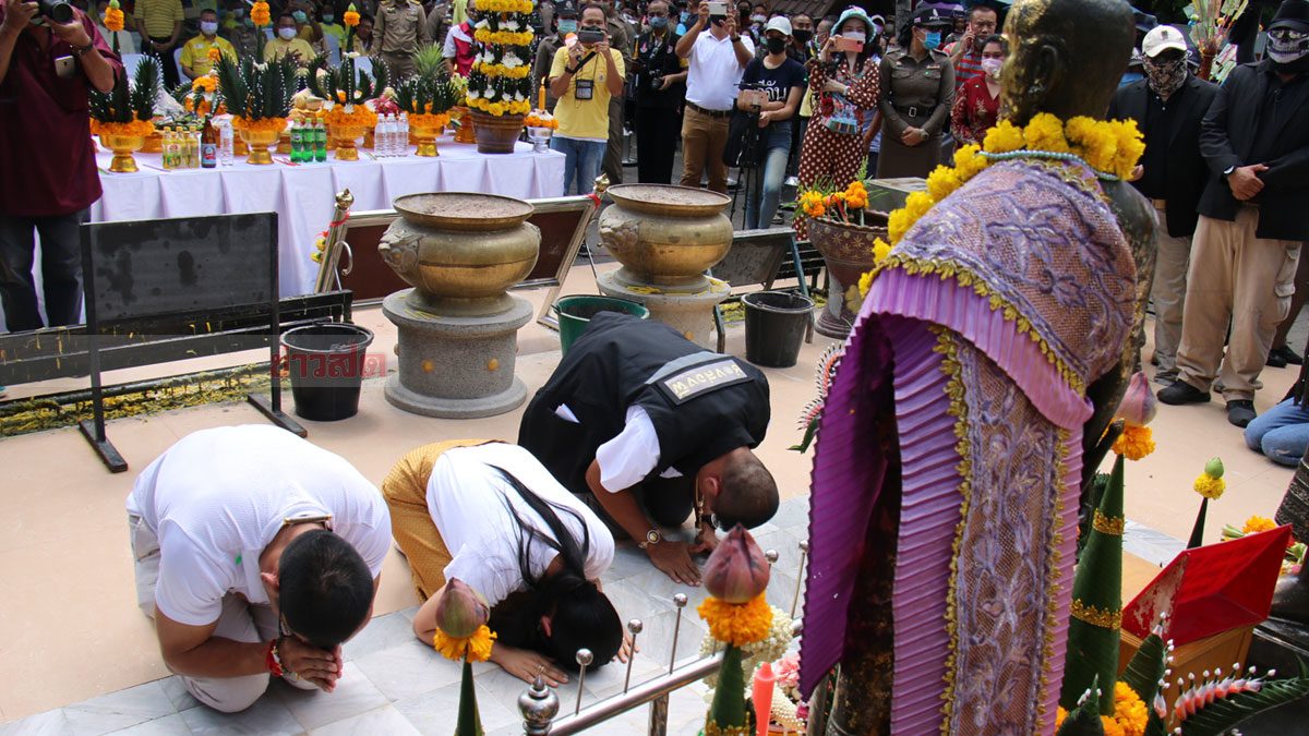 เมื่อเวลา 12.30 น.วันที่ 19 ก.ค. ที่ลานหน้าสถูปเจดีย์อัฐิอนุสาวรีย์ท้าวสุรนารีและน.ส.บุญเหลือ วัดศาลาลอย อ.เมืองนครราชสีมา นายวิเชียร จันทรโณทัย ผวจ.นครราชสีมา พร้อมหัวหน้าส่วนราชการ ตัวแทนจากกำนันผู้ใหญ่บ้าน กลุ่มสตรีนครราชสีมาและประชาชนจำนวนมาก เดินทางมาร่วมเป็นสักขีพยานและสังเกตการณ์ 3พิธีกรรายการช่องส่องผี ทำพิธีขอขมาย่าโมย่าบุญเหลือ