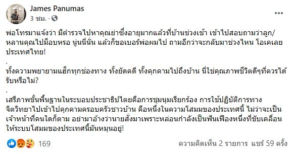 เจมส์ ภานุมาศ เผยตำรวจบุกบ้าน ถามหาหลานกับย่า แฉอีก พยายามแฮ็กทุกช่องทาง ถามนี่ใช่คุณภาพชีวิตดี ๆ ที่ควรได้หรือไม่ ลั่น อย่าอ้างนายสั่ง