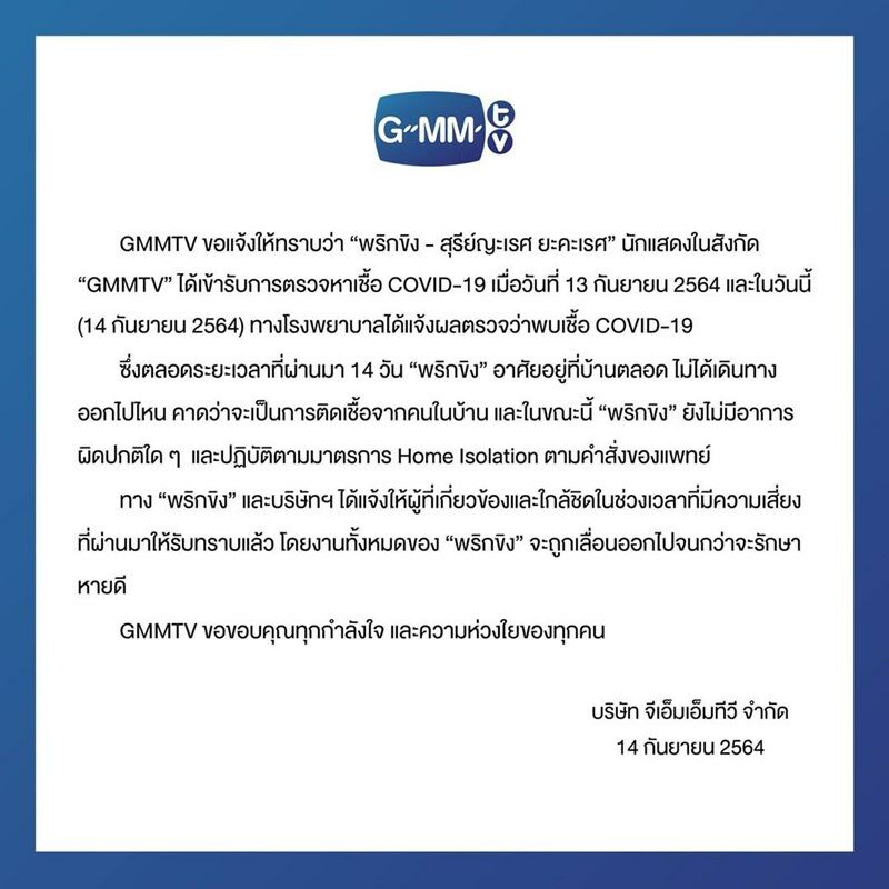 เนื้อความที่ประกาศผ่านทางไอจีของบริษัทฯ เขียนว่า GMMTV ขอแจ้งให้ทราบว่า พริกขิง สุรีย์ญะเรศ ยะคะเรศ นักแสดงในสังกัด “GMMTV” ได้รับการตรวจหาเชื้อ covid-19 เมื่อวันที่ 13 กันยายน 2564 และในวันนี้ (14 กันยายน 2564) ทางโรงพยาบาลได้แจ้งผลตรวจว่าพบเชื้อ covid-19