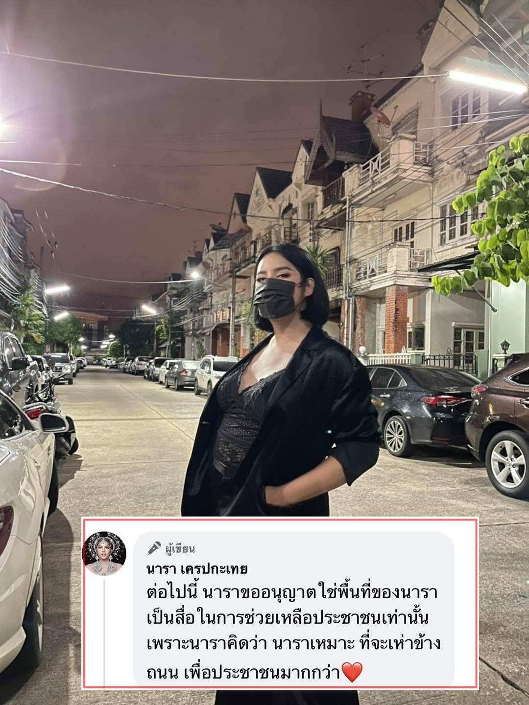 ต่อมา นารา ได้โพสต์ข้อความว่า “ต่อไปนี้ นาราขออนุญาตใช้พื้นที่ของนาราเป็นสื่อในการช่วยเหลือประชาชนเท่านั้น เพราะนาราคิดว่า นาราเหมาะที่จะเห่าข้างถนน เพื่อประชาชนมากกว่า”