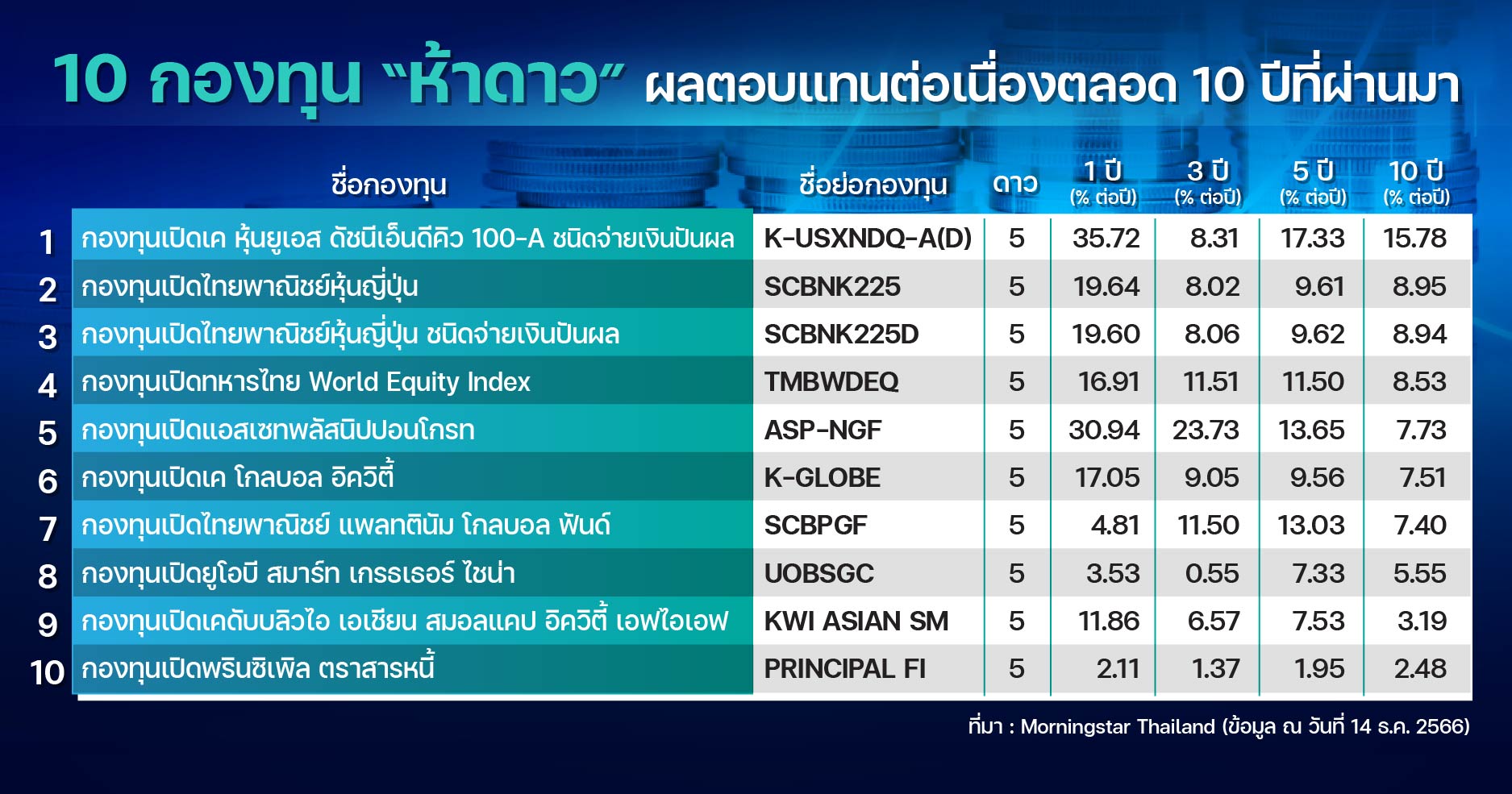 โดยจากการสำรวจข้อมูลเว็บไซต์ “Morningstar Thailand” พบ 10 กองทุน “5 ดาว” ผลตอบแทนต่อเนื่องตลอด 10 ปีที่ผ่านมา อิงข้อมูล ณ วันที่ 14 ธ.ค. 2566 เช่น กองทุนเปิดเค หุ้นยูเอส ดัชนีเอ็นดี คิว 100-A ชนิดจ่ายเงินปันผล หรือ K-USXNDQ-A (D) ในส่วนผลตอบแทนช่วง 1 ปี อยู่ที่ 35.72% ต่อปี ขณะที่ผลตอบแทนช่วง 3 ปี อยู่ที่ 8.31% ต่อปี ส่วนผลตอบแทนช่วง 5 ปี อยู่ที่ 17.33% ต่อปี และผลตอบแทนช่วง 10 ปี อยู่ที่ 15.78% ต่อปี