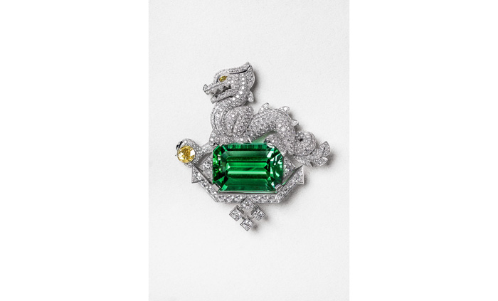 เมซงเชิดชูเกียรติของมังกร หนึ่งในสัญลักษณ์ของอาณาจักรสัตว์ของคาร์เทียร์ ด้วยเข็มกลัดดีไซน์ใหม่ สะท้อนความหลงใหลที่คาร์เทียร์มีต่อเอเชีย ท่ายืนหันข้างอย่างองอาจ สื่อถึงความเป็นผู้ปกป้องและผู้ล่าในเวลาเดียวกัน มังกรขยุ้มเพชรสีเหลืองไว้ในอุ้งเท้า พร้อมกับเฝ้าดูทัวร์มาลีนทรงแปดเหลี่ยมย่อมุมขนาด 30.11 กะรัต อย่างระแวดระวัง