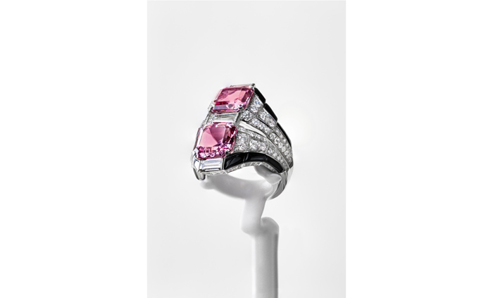 คาร์เทียร์เล่นกับความเป็นคู่แฝดของสปิเนลจากทาจิกิสถาน ด้วยดีไซน์ที่นำพลอยทั้งสองเม็ดมาวางประกบบนหัวแหวน Toi & Moi โฉมใหม่ กรอบข้างตัวเรือนฝังออนิกซ์ ชูความละเอียดของงานฝังอัญมณีขนาบข้างตัวเรือนแบบขั้นบันได เล่นกับเสียงสะท้อนและความสอดคล้องพ้องกันได้อย่างวิจิตรตระการตา