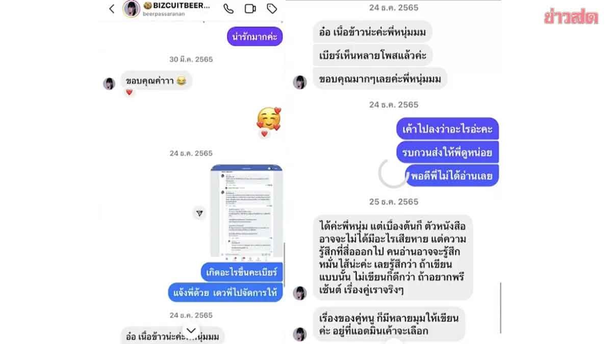 กระทั่งวันที่ 24 ธ.ค.65 ตนได้แชทไปหาเบียร์ เนื่องจากเพจโหนกระแสเคยลงเรื่องของอดีตแฟนของเบียร์และเบียร์ไว้ ซึ่งเพจโหนกระแสนั้น ตนไม่ได้เป็นแอดมิน และถูกบริหารจากบุคคลภายนอก ก่อนน้องเบียร์จะเข้ามาคอมเมนต์ต่อว่าเพจโหนกระแส ตนเห็นเข้าจึงแคปภาพและแชทไปถามเบียร์ว่าเกิดอะไรขึ้น จะจัดการให้ จากนั้นเบียร์ได้ชี้แจงกลับมาถึงข่าวนี้