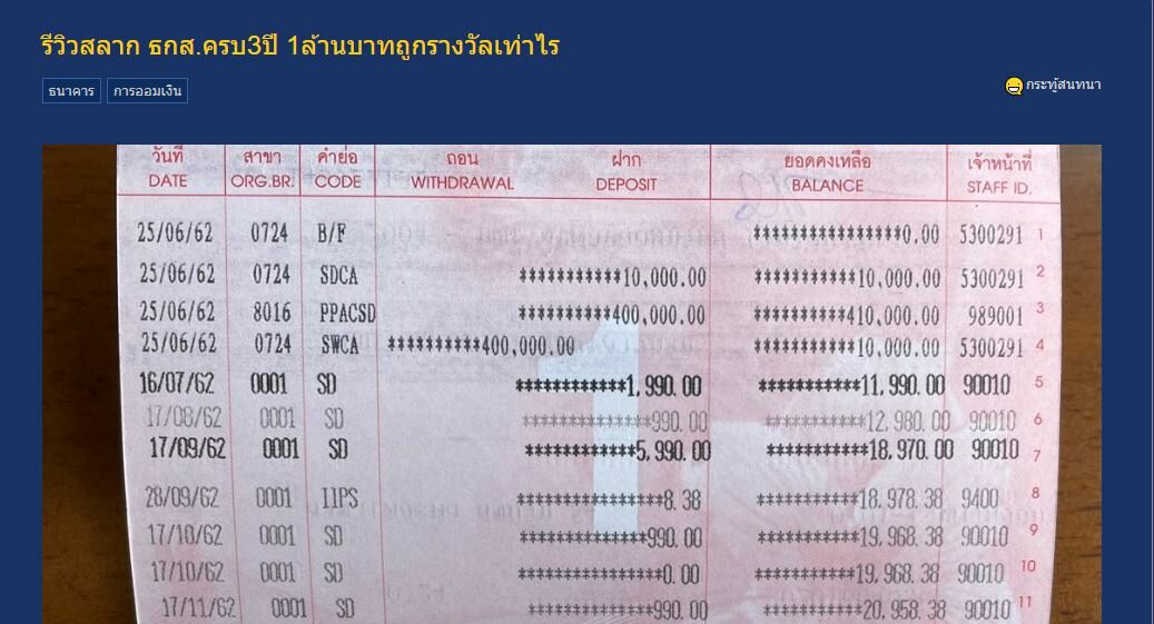 โดยพันทิป สมาชิกหมายเลข 6688280 สมาชิกเว็บไซต์พันทิปดอทคอม มีการตั้งกระทู้ "รีวิวสลาก ธ.ก.ส. ครบ 3 ปี กับเงิน 1 ล้านบาทถูกรางวัลเท่าไร" โดยถือเป็นกระทู้ที่ได้รับความสนใจอย่างมาก เพราะเป็นวิธีที่หลายๆ คน สงสัยว่า จะได้ผลตอบแทนคุ้มการลงทุนหรือไม่ ซึ่งหนุ่มรายนี้ เลือกลงทุน ใน ธ.ก.ส.1 ล้านบาท และสลากออมสิน 2 ล้านบาท