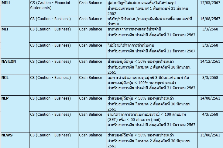 ขณะที่หลักทรัพย์ที่ติดเครื่องหมาย CS (Financial Statement) อาทิ CHO, CMO, COMAN, DIMET, EE, ITD, MILL, NRF, SAM และ TSR