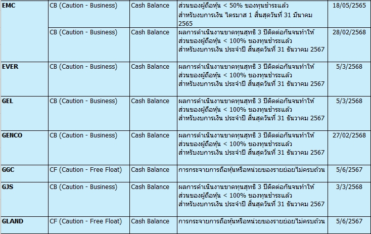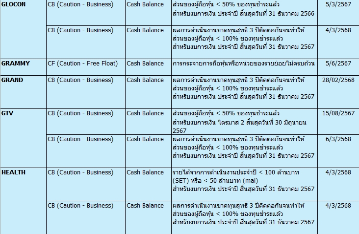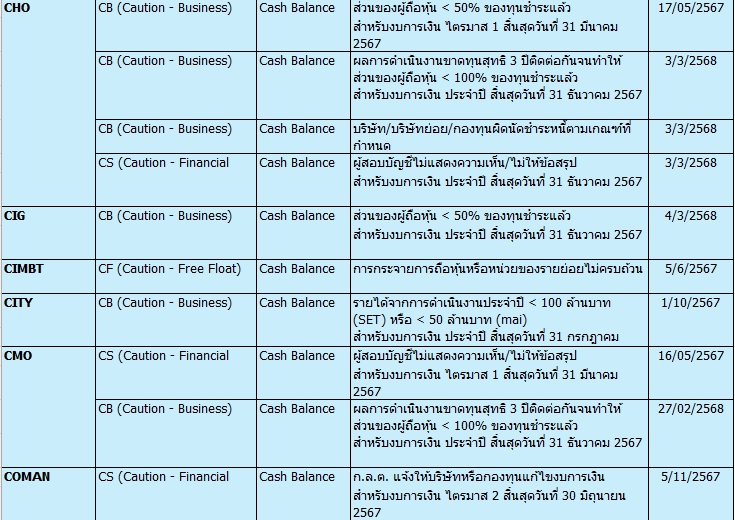 1.เครื่องหมาย CB (Business) ปัญหาฐานะการเงินหรือการดำเนินงาน อาทิ ส่วนของผู้ถือหุ้น (Equity) ต่ำกว่า 50% ของทุนชำระแล้ว ศาลรับคำร้องขอฟื้นฟูกิจการหรือล้มละลาย ถูกสั่งให้แก้ไขฐานะทางการเงินหรือการดำเนินงาน ขาดทุนต่อเนื่อง 3 ปี จน Equity น้อยกว่าทุนชำระแล้ว การไม่มีธุรกิจโดยมีรายได้จากการดำเนินงานต่อปี ต่ำกว่า 100 ล้านบาท (SET) และ 50 ล้านบาท (mai) รวมถึงการผิดนัดชำระหนี้กับสถาบันการเงินหรือหุ้นกู้