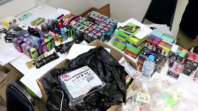 พร้อมของกลาง ประกอบด้วย 1.หัวพอร์ตบุหรี่ไฟฟ้ายี่ห้อต่างๆจำนวน 386 ชิ้น 2.หัวพอร์ตบุหรี่ไฟฟ้าชนิดใช้แล้วทิ้ง จำนวน 103 ชิ้น 3.น้ำยาบุหรี่ไฟฟ้ายี่ห้อต่างๆจำนวน 58 ชิ้น 4.คอยร์ใช้สำหรับกรอง จำนวน 56 อัน 5.เครื่องดูด 1 อัน 5.โทรศัพท์ยี่ห้อไอโฟน 13 จำนวน 1 เครื่อง