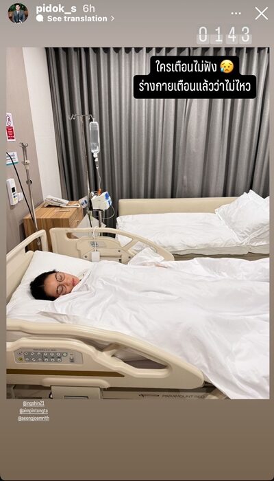 ผู้สื่อข่าวรายงานว่า ขณะที่ นายปิฎก สุขสวัสดิ์ สามี ได้โพสต์ภาพนายกฯขณะแอดมิตที่โรงพยาบาล พร้อมข้อความว่า "ใครเตือนไม่ฟัง ร่างกายเตือนแล้วไม่ไหว" ลงไอจีสตอรี่ส่วนตัว