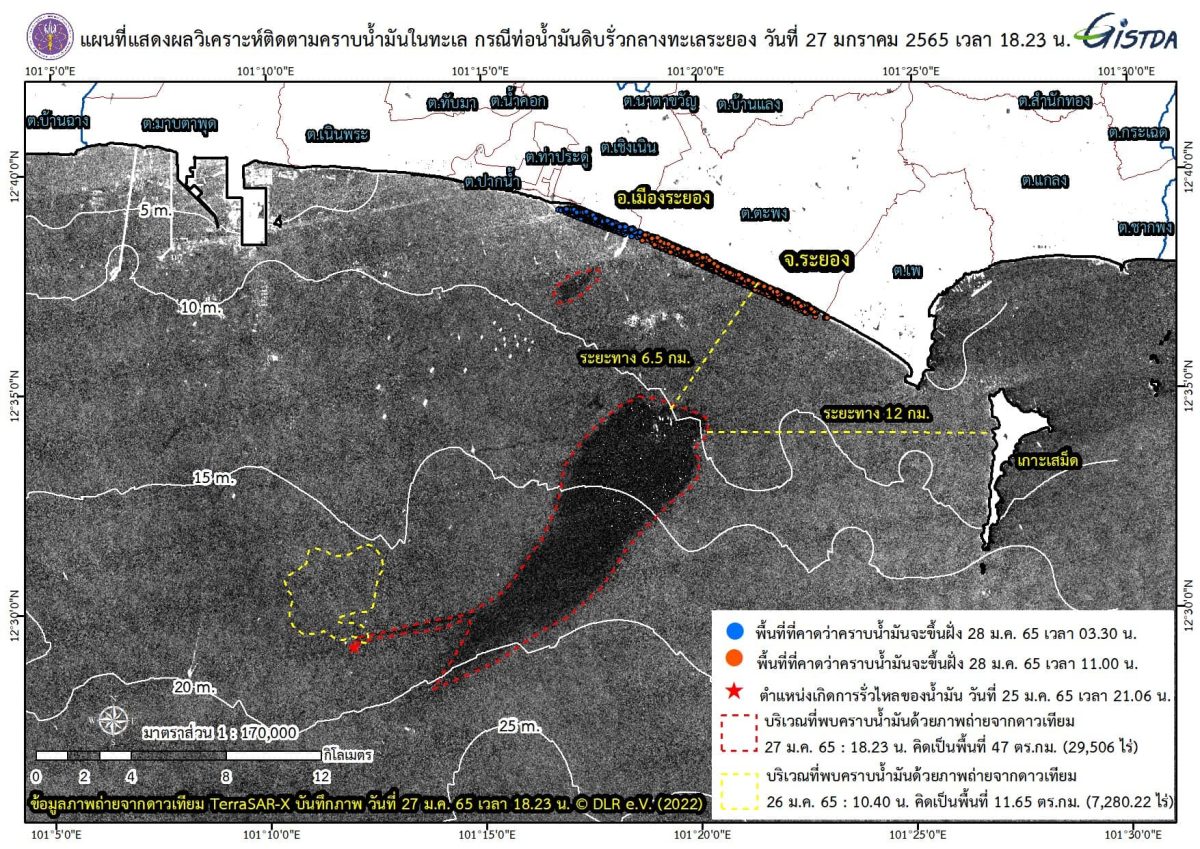 ล่าสุดภาพถ่ายจากดาวเทียม TerraSAR-X ของ GISTDA เมื่อวันที่ 27 มกราคม 2565 เวลา 18.23 น. แสดงให้เห็นถึงคราบน้ำมันลอยแผ่เป็นบริเวณกว้างกว่าเดิม (กรอบสีแดง) คิดเป็นพื้นที่ 47 ตารางกิโลเมตร (29,506 ไร่) หรือกว่า 9 เท่าของเกาะเสม็ด และมีทิศทางเคลื่อนที่ไปทางทิศด้านตะวันออกเฉียงเหนือ (จากจุดเดิม) ซึ่งคราบน้ำมันดังกล่าวอยู่ห่างจากชายฝั่งทะเลของอำเภอเมืองระยอง ประมาณ 6.5 กิโลเมตร และห่างจากเกาะเสม็ด ประมาณ 12 กิโลเมตร และคาดว่าคราบน้ำมันจะขึ้นฝั่งในวันศุกร์ที่ 28 มกราคม 2565 (จุดสีน้ำเงิน และสีส้ม) ซึ่งอาจส่งผลกระทบต่อพื้นที่ชายฝั่งเมืองระยอง ชายหาดแม่รำพึง และพื้นที่ชายหาดใกล้เคียง