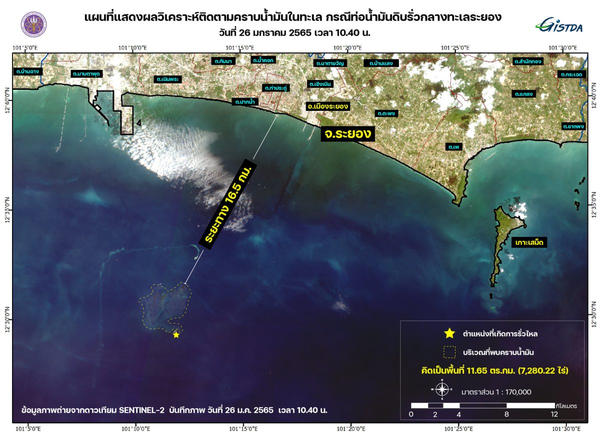 ก่อนหน้านี้ สำนักงานพัฒนาเทคโนโลยีอวกาศและภูมิสารสนเทศ (องค์การมหาชน) หรือ GISTDA ติดตามคราบน้ำมันดิบที่รั่วไหลสู่ทะเลตั้งแต่คืนวันที่ 25 มกราคม 2565 โดยเมื่อวันที่ 26 มกราคม 2565 เวลา 15.17 น. GISTDA ถ่ายภาพด้วยดาวเทียม Sentinel-2 พบว่าคราบน้ำมันที่รั่วไหล คิดเป็นพื้นที่ 11.65 ตารางกิโลเมตร (7,280 ไร่) หรือกว่า 2 เท่าของเกาะเสม็ด